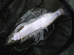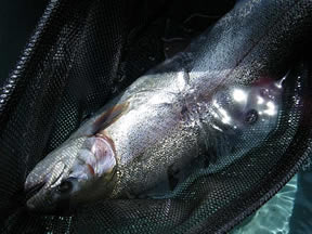 佐野 様 レインボートラウト43cm、1.1kg ナカジマミノーのトローリング ポイントは小島 |