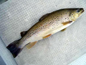 飯島 様 ブラウントラウト42.5cm、1.04kg TP75Fのトローリング ポイントは元箱根湾 |