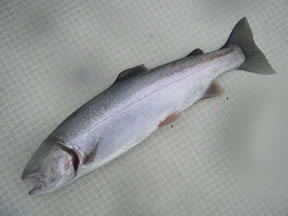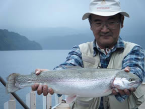 植松様 レインボートラウト41.5cm、0.82kg ナカジマミノーアワビのトローリング ポイントは元箱根湾 |
