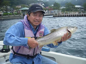| 石井 様 ブラウントラウト56cm、2.3kg カズミノー100FSAのトローリング80ヤード ポイントは清水ダキ |