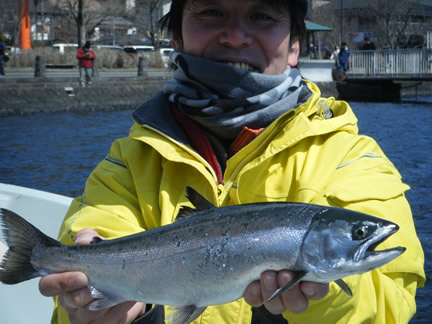 2015年3月25日(水曜) 天候:晴時々曇/気温:2.0〜8.0/水温:7.5/風向:南東/水色:やや濁り 釣果 レインボートラウト25.0cm〜60.5cm/1尾〜10尾