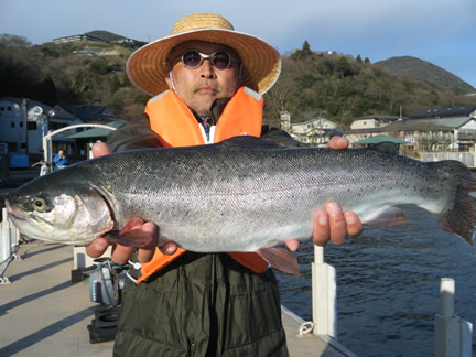 早川 様 レインボートラウト60.5cm,2.68kg MSブラックのフライキャスティング ポイントは元箱根湾