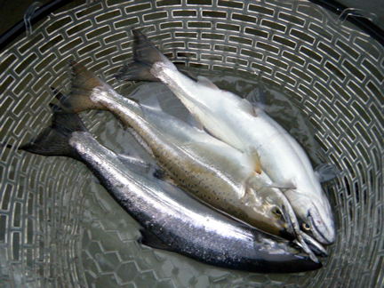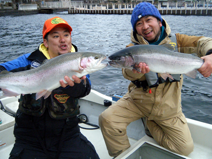 2015年4月2日(木曜) 天候:曇/気温:5.0〜11.0/水温:8.0/風向:北東/水色:やや濁り 釣果 レインボートラウト25.0cm〜65.0cm/2尾〜15尾 サクラマス35.0cm〜44.5cm/0尾〜2尾
