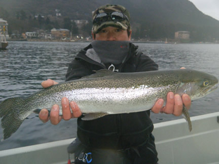 2016年3月20日(日曜) 天候:雨後晴/気温:5.0〜8.0/水温:7.8/風向:北東/水色:やや濁り 釣果 レインボートラウト25.0cm〜62.0m/1尾〜15尾 ブラウントラウト41.5cm/1尾